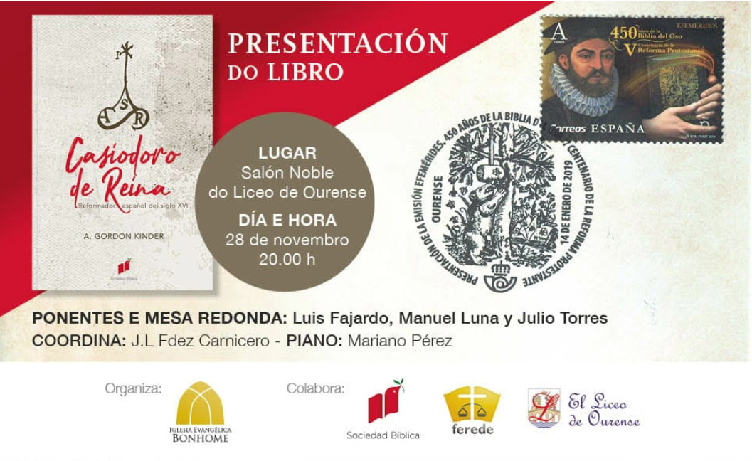 El próximo jueves 28 de noviembre, tendrá lugar el acto de presentación del libro de A. Gordon Kinder sobre Casiodoro de Reina, traducido al español por Sociedad Bíblica. El acto incluirá una mesa redonda con la participación de los pastores Manuel Luna, Julio Torres, y el director general de la Sociedad Bíblica, Luis Fajardo.