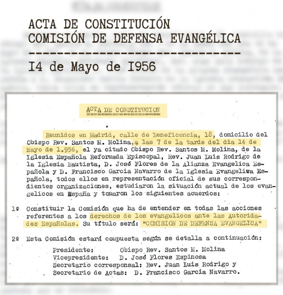 Fruto de la reflexión, desbordados en buena medida por los problemas y sintiéndose guiados por Dios en sus oraciones, los evangélicos de las cuatro denominaciones entonces existentes en Madrid (hermanos, bautistas, de la IERE y de la IEE), decidieron constituirse en Comisión de Defensa Evangélica (CDE) y dotarla de recursos para que afrontara la situación que se estaba padeciendo. Cuatro denominaciones, cuatro representantes y un solo propósito: la ayuda a de los creyentes y de las iglesias y la defensa de la libertad religiosa, cuya acta de constitución se firmó el 14 de abril de 1956.