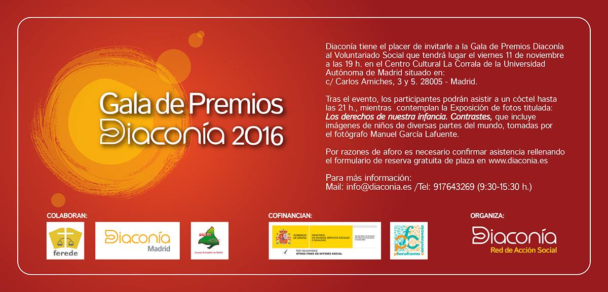 Desde Diaconía se nos invita a participar en la gala de este año. Por razones de aforo es necesario confirmar asistencia rellenando el formulario de reserva gratuita. Una vez cumplimentado, el solicitante recibirá un correo electrónico confirmando su recepción. No obstante, para cualquier duda o información adicional se ofrece un correo electrónico: info@diaconia.es. También un tfno.:91 764 32 69 (de 9:30 a 15:30hrs).
