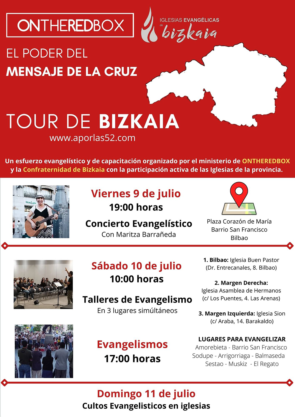 El tour arranca este viernes 9 de julio con un Concierto Evangelístico al aire libre con la cantautora mexicana Maritza Barreñada, en el barrio San Francisco de Bilbao. El sábado 10 de julio se efectuarán 3 jornadas simultáneas de capacitación de evangelistas en Bilbao, Las Arenas y Barakaldo. Ese mismo sábado por la tarde los equipos de evangelistas se distribuirán en los pueblos sin testimonio evangélico, entre ellos Amorebieta, San Francisco, Sodupe, Arrigorriaga, Balmaseda, Sestao, Muskiz y El Regato.