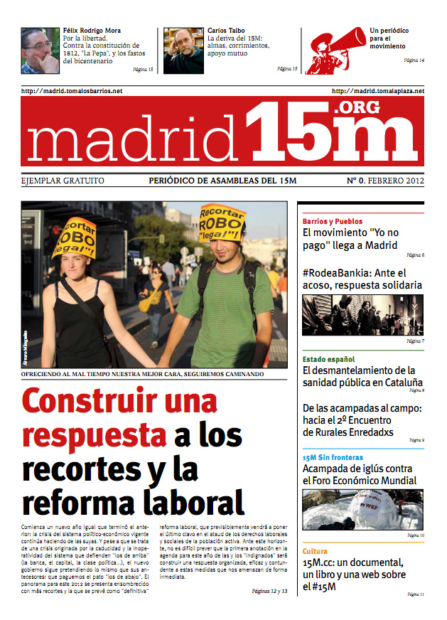 (Europa Press | Madrid, 03/02/2012) Diversas asambleas del movimiento ciudadano 15-M han creado el periódico gratuito ‘Madrid 15M’, que tendrá una tirada inicial de 20.000 ejemplares, financiados por el propio colectivo, y que prescindirá de la figura director, así como del editorial. Este sábado 4 de febrero, a las 12.00 horas, se presentará oficialmente el número cero en el centro autogestionado El Eko, en la calle Algorta de Madrid.