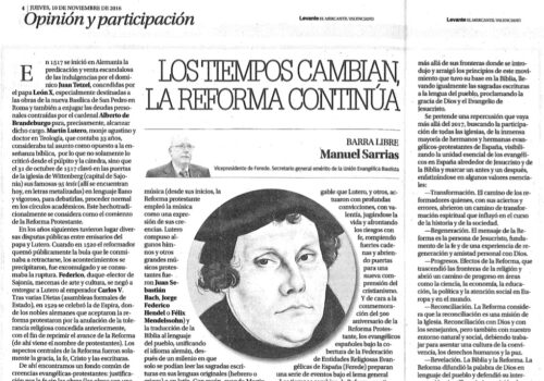 Secretario General de la Unión Evangélica Bautista de España desde 1982. Relaciones y presencias en Europa, Estados Unidos, América Latina, Camerún y Guinea Ecuatorial (África), Israel, Corea del Sur y Australia. Miembro del Comité Organizador del VI Congreso Evangélico Español (con Audiencia Real en 1.997) y actual miembro de la Comisión Permanente de la Federación de Entidades Religiosas Evangélicas de España (F.E.R.E.D.E), de la que durante varios años ha sido Vicepresidente, estando en la misma desde enero de 1990. Contactos puntuales con partidos políticos, especialmente de la Comunidad Valenciana.