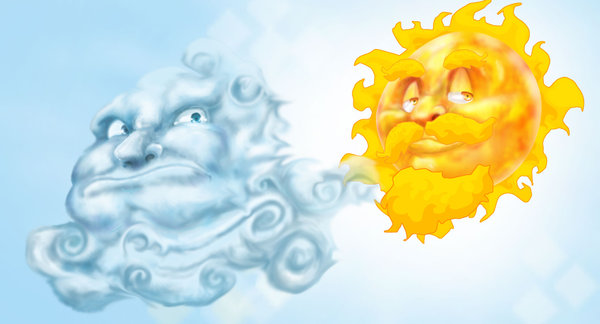 -Creo que es mi turno –le dijo el sol al frustrado viento-. Sonrió el astro rey mostrándose entre dos nubes, envió delicadas dosis de calor, y con un gesto agradecido el hombre se desprendió de su capa, se la echó al hombro y siguió feliz su camino.