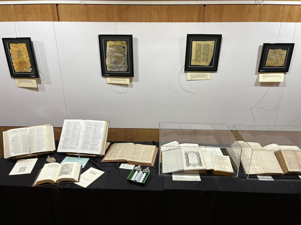 La exposición consta de varios paneles de carácter pedagógico, así como de ejemplares de ediciones facsímiles, pergaminos, réplicas de originales acreditados por organismos oficiales de Jerusalén, y una gran cantidad de Biblias en diferentes idiomas y formatos.