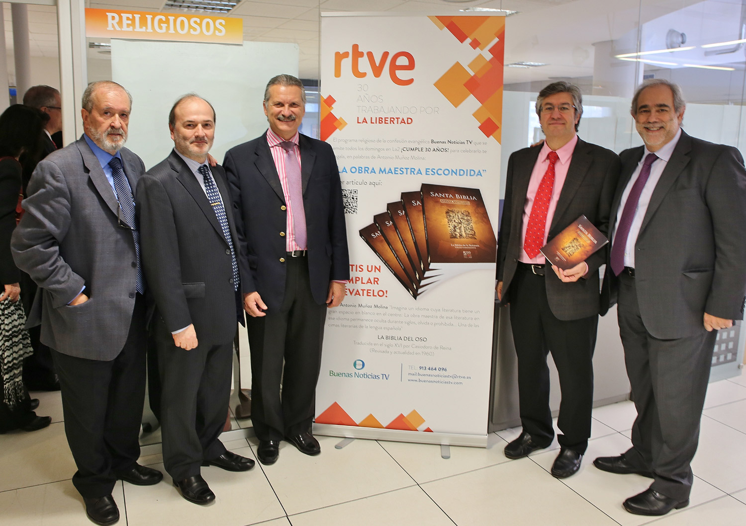 Visita al expositor de biblias en RTVE: Izq. a der: Manuel G. Lafuente y Daniel Rodríguez (FEREDE); Manuel Cerezo (CEM); Mariano Blázquez y José L. Andavert (FEREDE)