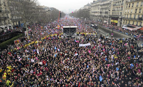 (PARIS, 25/03/2013) Cientos de miles de personas salieron este domingo a las calles del centro de París para protestar contra los planes del presidente francés, François Hollande, de legalizar el matrimonio entre homosexuales y su derecho a adoptar antes de junio.