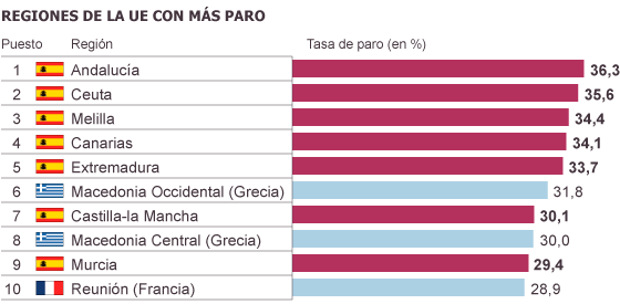 Andalucía (que cerró 2013 con un 36,3% de paro), Ceuta (35,6%), Melilla (34,4%), Canarias (34,1%) y Extremadura (33,7%) copan los primeros puestos de una clasificación en cuya versión ampliada también figuran Castilla-la Mancha (séptima, con un 30,1%), Murcia (novena, con un 29,4%), dos regiones griegas —Macedonia Occidental y Macedonia Central— y una francesa —Reunión—. En el extremo opuesto de la lista seis regiones alemanas, dos austriacas y una checa se erigen como las más atractivas a la hora de encontrar trabajo. En materia de desempleo juvenil, las regiones españolas también ocupan un lugar destacado de la lista negra de la UE.