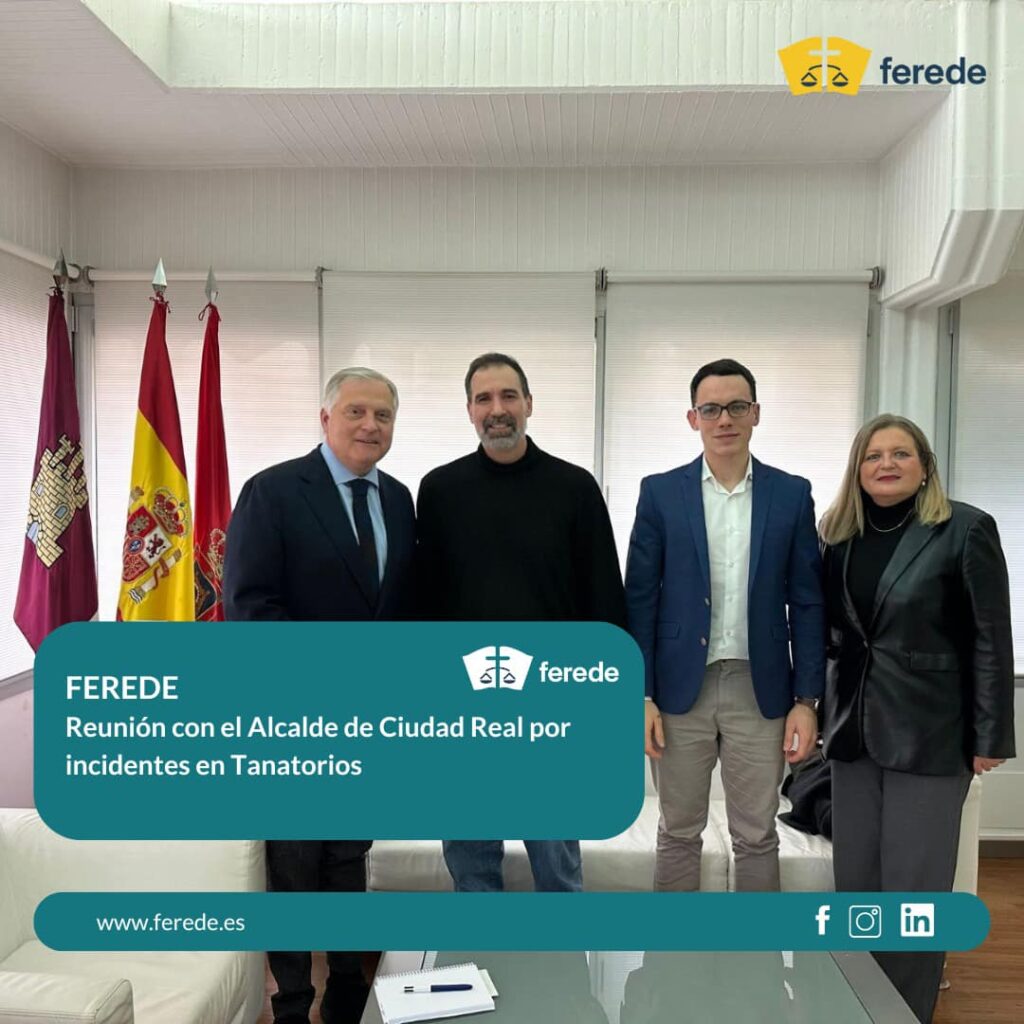 (Redacción, 13/11/2024) Este miércoles, 13 de noviembre por la mañana se han reunido el pastor de la Iglesia Evangélica La Roca, de Ciudad Real, Fernando Ramírez y el abogado del Servicio Jurídico de FEREDE, Álvaro Serrano, con el alcalde de Ciudad Real, Francisco Cañizares, y con la concejala de Servicios Sociales del Ayuntamiento ciudadrealeño, Aurora Galisteo, con relación a un incidente acontecido en los tanatorios de la ciudad manchega el pasado mes de abril.