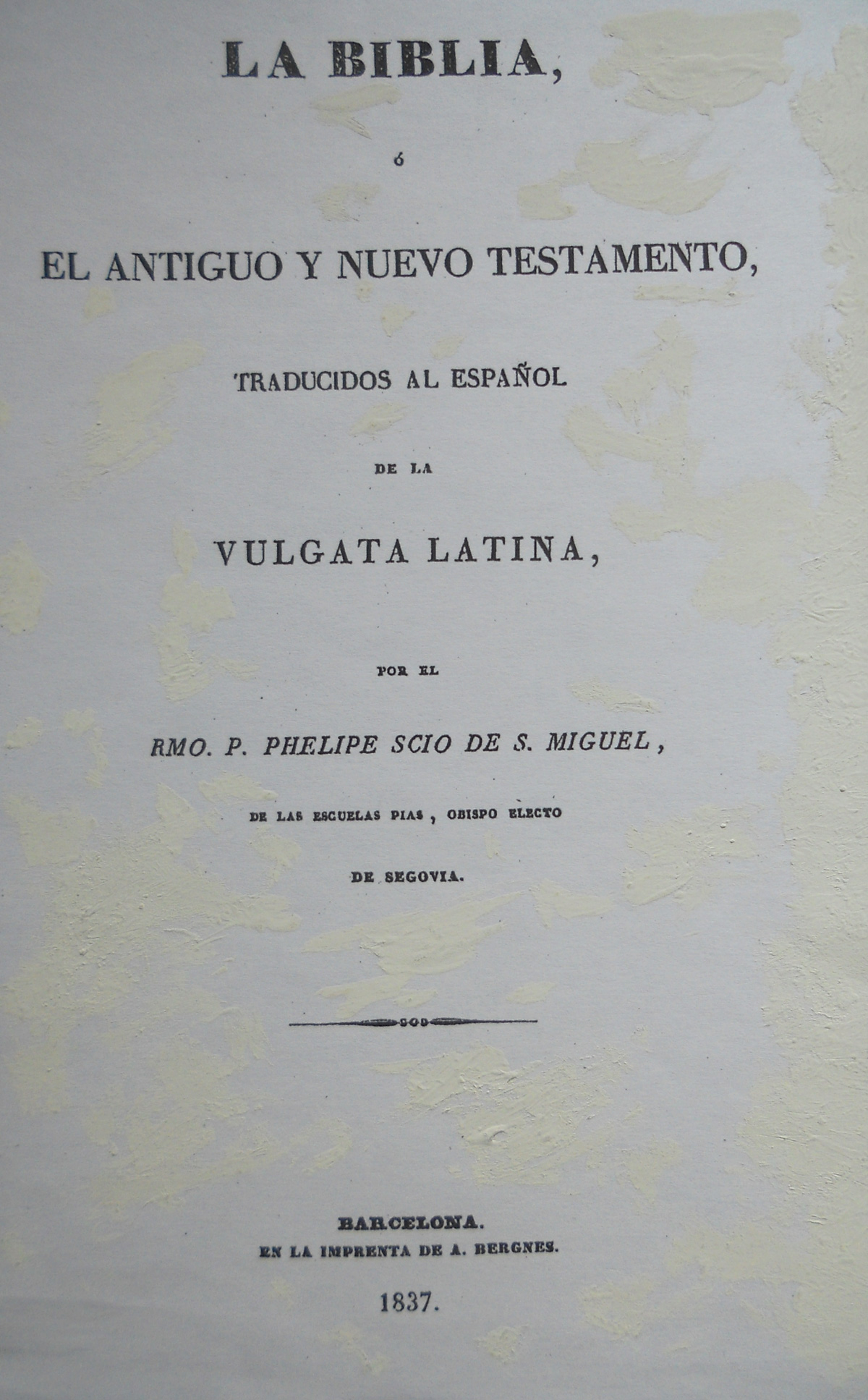 Y el año siguiente, en la misma ciudad e imprenta, publicó en castellano, según la traducción del Padre Scio, el Nuevo Testamento (3.000 ejemplares) y la Biblia (3.000 ejemplares). La primera vez que se había publicado (Valencia, 1790-93), se presentó en diez volúmenes.
