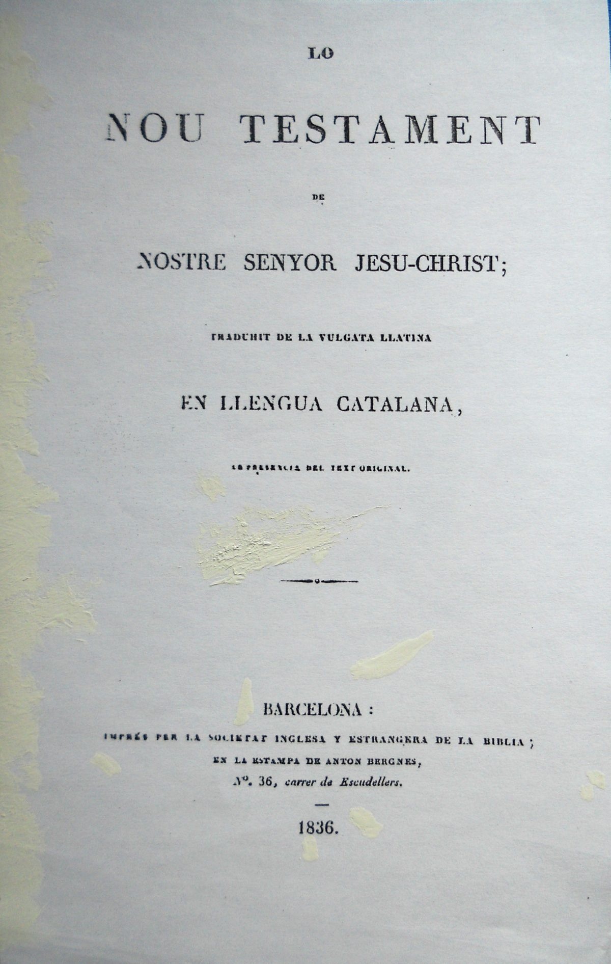 Portada de “Lo Nou Testament de Nostre Señyor Jesu-Christ” (Barcelona, 1836. Edición de Graydon)