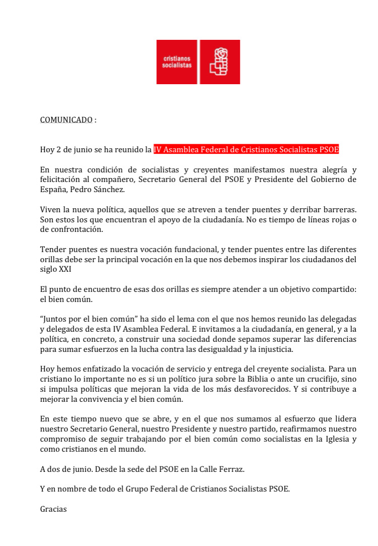 Las circunstancias políticas hicieron que la cita de Cristianos Socialistas coincidiera de manera fortuita en el tiempo con el día en que el secreterio general del PSOE, Pedro Sánchez, prometía su cargo como nuevo presidente del Gobierno en el Palacio de la Zarzuela. Lejos estaba de imaginar esta situación su coordinador federal, Juan Carlos González, cuando hace meses publicó la convocatoria a dicha Asamblea.