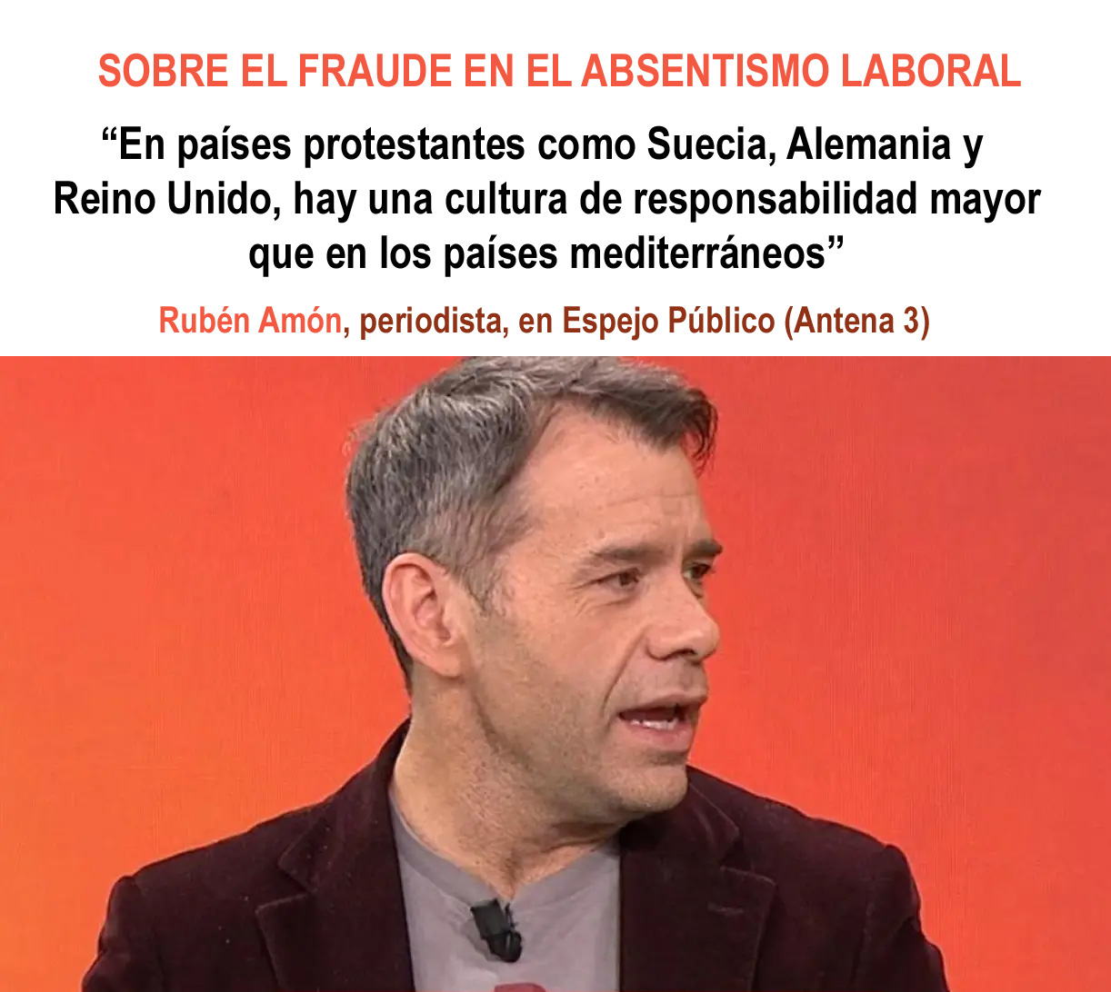 Ante la comparación de un experto, que señalaba que los índices de absentismo en España superan de largo los de Reino Unido, Suecia o Alemania, Amón apuntó sin rodeos: “son países protestantes”, dijo, subrayando que “la conciencia y la responsabilidad respecto al trabajo es muy superior a la que tenemos en los países mediterráneos”. No lo mencionó explícitamente, pero todos comprendimos la contraposición: una cultura protestante frente a otra de raíz católica.