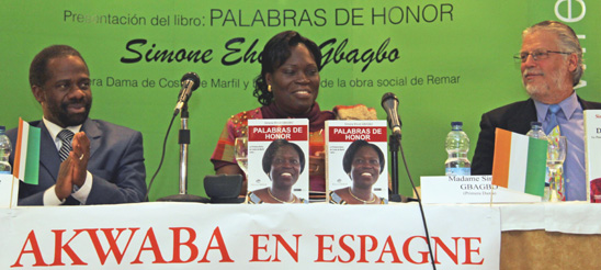 Los intervinientes que precedieron a la Sra. Gbagbo no escatimaron elogios hacia la persona y la obra de la autora de Palabras de Honor, a quien calificaron de ‘paradigma de la mujer líder africana representada en toda su dimensión’, y le dedicaron palabras de reconocimiento por su honestidad, coherencia, fe y valentía, puestas al servicio de su pueblo para construir una Costa de Marfil desarrollada, soberana y democrática. Los elogios de los intervinientes eran recibidos con gestos de humildad por la Sra. Gbagbo, e interrumpidos por reiterados aplausos y ovaciones del numeroso público marfileño presente en la sala. En cuanto a "Palabras de Honor", la versión en español realizada por Ediciones REMAR del original en francés ("Paroles d’ Honneur"), Jean Claude-Rochat señaló que se trataba de "un testimonio histórico de gran significación". El pastor Miguel Díez, en su intervención, se sumó a quienes destacaban las cualidades humanas de la Sra. Gbagbo: "Como dice el libro, se trata de una mujer que tiene ‘palabra de honor’", y recordaba cómo había apoyado la obra social de Remar en Costa de Marfil, cediéndoles un terreno de 20 hectáreas para la construcción de un centro escolar y deportivo que acogerá a 3.000 niños socialmente excluidos. "Le ofrecimos a Madame Gbagbo la Presidencia de Honor de Remar en Costa de Marfil, y nos complace que la haya aceptado", concluía Díez, expresándose de forma intermitente en español y en un francés fluido. Palabras de Honor La última en intervenir fue la Sra. Gbagbo, quien agradeció los elogios y tuvo palabras de especial reconocimiento para los anfitriones, para sus compañeros de mesa y para algunos de los presentes que habían apoyado y contribuido a la redacción y a la publicación del libro: "Era necesario escribir este libro para contar lo que realmente pasó en Costa de Marfil", subrayó en un discurso improvisado, que fue muy aplaudido, y en el que no faltaron las referencias a su esposo Laurent Koudou Gbagbo, presidente del país desde el 26 de octubre de 2000 y su esposo y compañero desde la juventud, a quien dedica unas emotivas palabras llenas de admiración en la primera página de su libro: