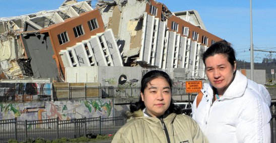 (LOLA CALVO, 18/03/2011) Shoko Takahashi es la fundraiser de la Sociedad Bíblica de Japón, a su lado su compañera Emi Beland, encargada de las relaciones internacionales. Esta foto fue tomada en agosto 2010, por Javier García, frente a un edificio partido en dos por el terremoto que devastó una buena parte de Chile en febrero del mismo año. Shoko y Emi fueron a entregar una donación por parte de la Sociedad Bíblica de Japón y recabar información para sus donantes.