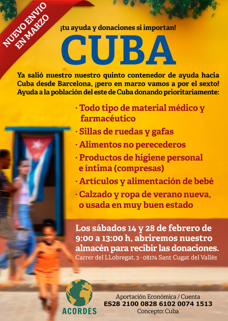 La Asociación para la Cooperación con Recursos para el Desarrollo (ACORDES) ha anunciado el envío de su quinto contenedor de ayuda humanitaria con destino a Cuba, en una nueva acción solidaria que refuerza su compromiso con las poblaciones más vulnerables. La entidad de inspiración evangélica, y con más de dos décadas de trayectoria en el ámbito social y humanitario, abrirá las puertas de sus almacenes el próximo sábado 28 de febrero para recoger donaciones destinadas a esta causa.