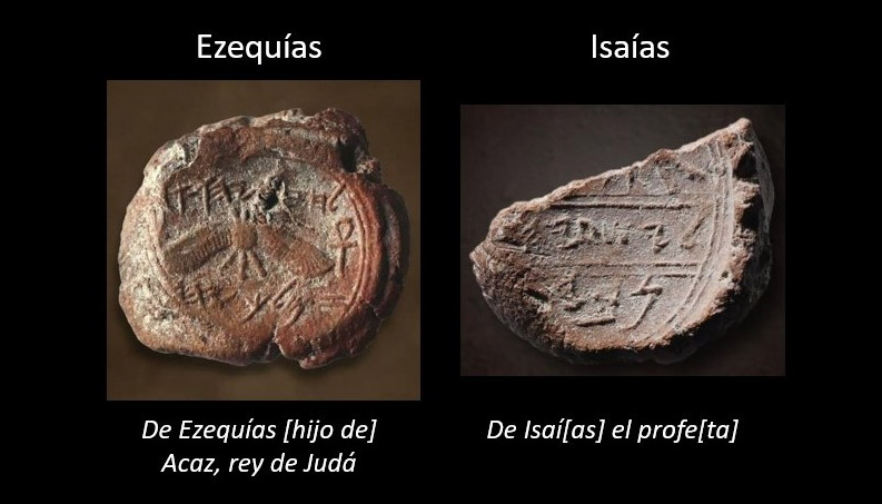 El primero consiste en una impresión en arcilla del sello del Rey Ezequías. La inscripción dice “De Ezequías [hijo de] Acaz, rey de Judá”.