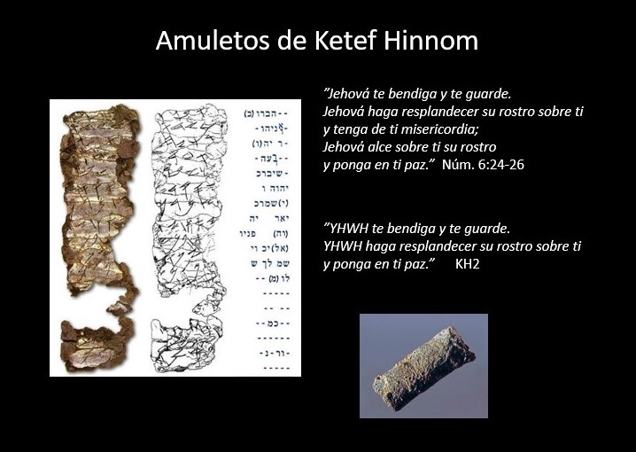 Los amuletos de Ketef Hinnom se hallaron en unas tumbas de Jerusalén en 1979. Se trataba de unos rollos de plata diminutos, de no más de 3 cms. de ancho y un diámetro de menos de 1 cm. Al desenrollarlos se descubrió el texto. El segundo amuleto, el de la foto, contiene parte de la bendición sacerdotal.
