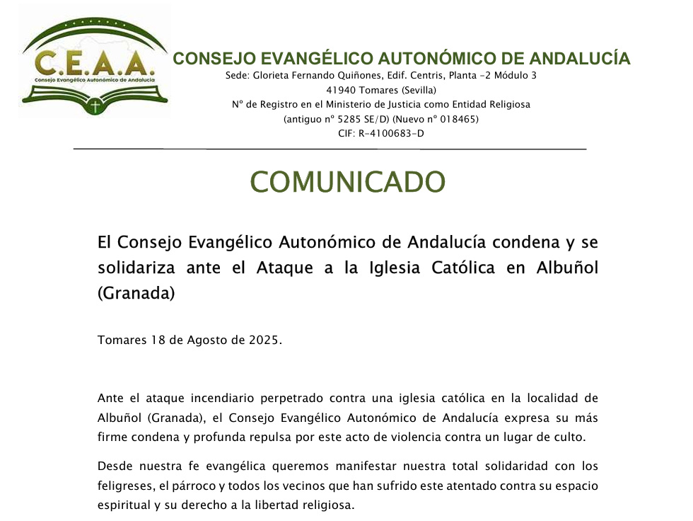 (Redacción, 19/08/2025) El Consejo Evangélico Autonómico de Andalucía (CEAA) ha hecho público un comunicado en el que rechaza el ataque incendiario perpetrado el pasado domingo contra la iglesia de Santiago Apóstol, en la pedanía de El Pozuelo, en Albuñol (Granada).