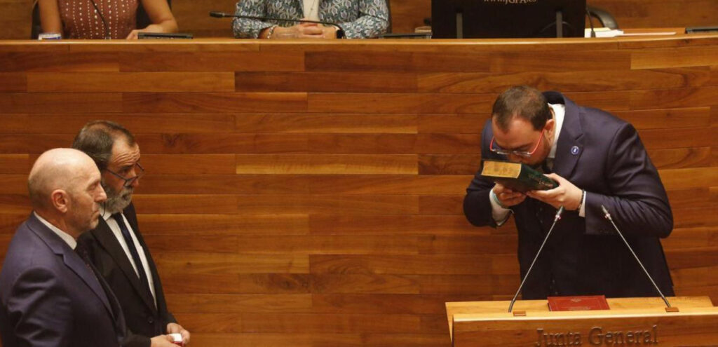 (JORGE FERNÁNDEZ, 04/07/2023) La foto del presidente en funciones del Principado de Asturias y líder socialista, Adrián Barbón, besando la Biblia durante el acto de constitución del Parlamento Asturiano hace una semana se ha hecho viral y ha provocado todo tipo de reacciones.