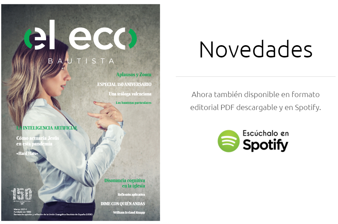 “Tras semanas de trabajo, en colaboración con la plataforma de conversión de idiomas www.grancomision.media y de forma pionera en nuestra prensa evangélica, los artículos de EL ECO BAUTISTA se pueden escuchar individualmente al acceder a los artículos en www.uebe.org y también en el nuevo podcast del mismo nombre que acabamos de publicar en Spotify”, explica Daniel Banyuls, secretario general de la UEBE y director de El ECO BAUTISTA.