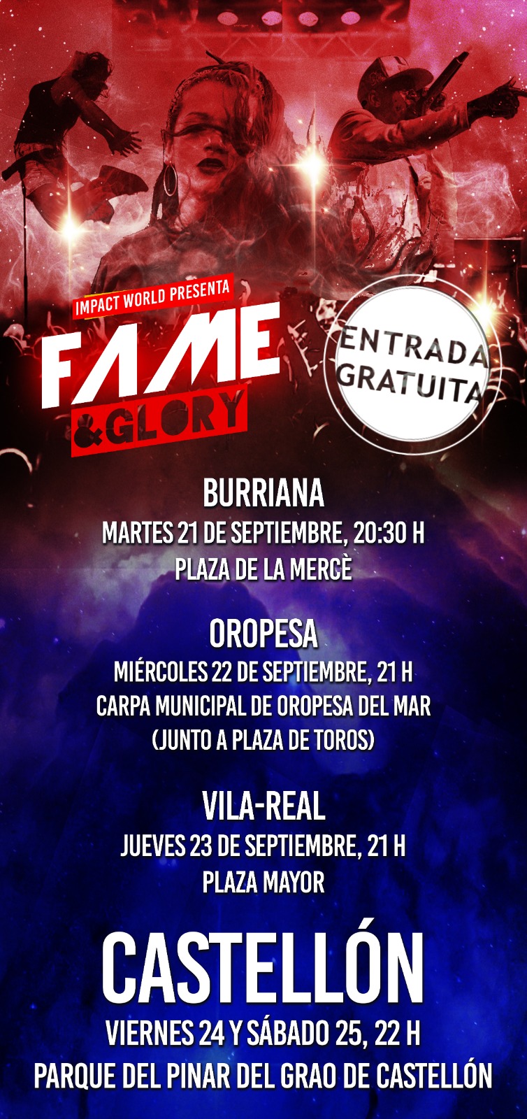 Del 21 al 25 de septiembre, los jóvenes artistas provenientes de Estados Unidos, España, Brasil y Camerún, entre otras nacionalidades, presentarán este show que ya ha estado en varios países y en más de 20 ciudades españolas. El primer espectáculo tendrá lugar en Burriana el martes 21 a las 20:30 en la Plaça de la Mercè; seguido por Oropesa del Mar el miércoles 22 a las 21:00 en la Carpa Municipal junto a la plaza de toros; en Vila-Real el jueves 23 a las 21:00 en la Plaza Mayor; y dos grandes shows principales en el Pinar del Grao de Castellón el viernes 24 y sábado 25 a las 22:00 horas.