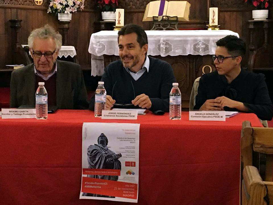 Los ponentes invitados para exponer sobre el citado tema fueron, Ángela González Montes, miembro de la Comisión ejecutiva del PSOE-Madrid (Secretaría Ejecutiva de Modernización de Administraciones Públicas); y Máximo García Ruiz, conocido escritor y teólogo protestante.