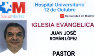 (Madrid, 20/02/2009) Desde el pasado día 18 de febrero, el Hospital Universitario 12 de Octubre de Madrid, cuenta con los servicios de dos pastores evangélicos y un diácono colaborador, para prestar un servicio de asistencia pastoral entre los pacientes del hospital. La impresión de las credenciales correspondientes marcó la culminación de unas conversaciones que se venían desarrollando desde hace aproximadamente un año y en las que participaron la Iglesia Evangélica Servidores de Vida y el Consejo Evangélico de Madrid (CEM) De momento los acuerdos comprenden la posiblidad de ofrecer una atención espiritual a todos los pacientes (independientemente de su confesión religiosa), que quieran recibir consuelo y ánimo. Según el pastor Juan José Roman López (en la foto) – quien además es el Secretario del Servicio Territorial de Asistencia Religiosa en Prisiones de Madrid (STARP) -, la dirección del hospital se ha comprometido, además, a habilitar un Salón de Actos donde poder celebrar un día a la semana las reuniones de Culto.