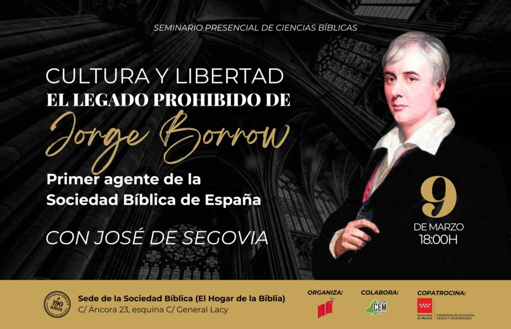 El seminario, titulado Cultura y Libertad: El legado prohibido de George Borrow, se celebrará de forma presencial en la sede de Sociedad Bíblica conocida como El hogar de la Biblia, en la calle Áncora 23 esquina con General Lacy. Tras la conferencia se ofrecerá un tiempo de encuentro fraternal, en un ambiente de celebración por casi dos siglos de servicio continuado.