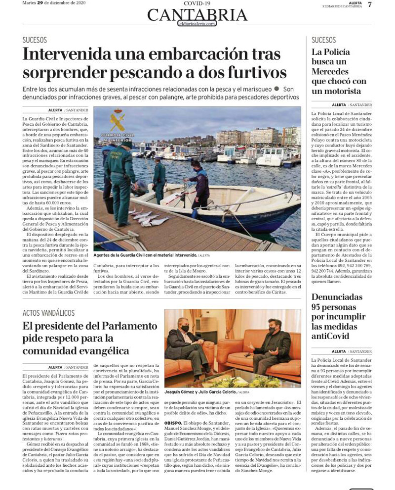 “Gómez ha recibido en su despacho al presidente del Consejo Evangélico de Cantabria, el pastor Julio García Celorio, a quien ha trasladado su solidaridad ante los hechos acaecidos y ha reprobado la conducta de ‘aquellos que no respetan la convivencia ni la pluralidad’”.