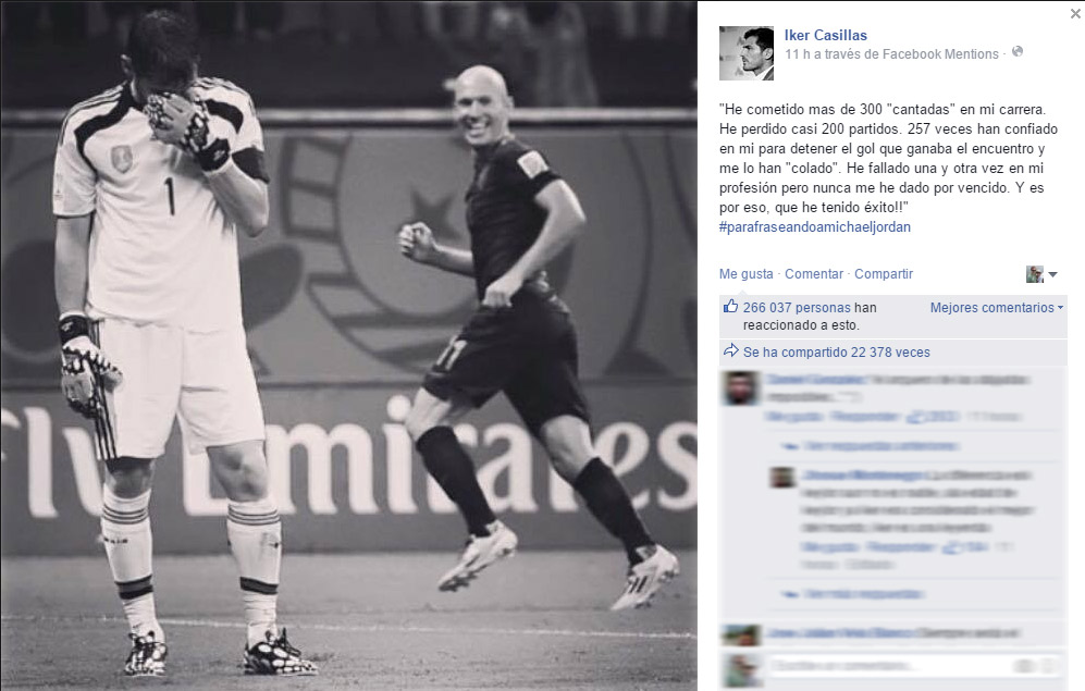 «He cometido más de 300 «cantadas» en mi carrera. He perdido casi 200 partidos. 257 veces han confiado en mí para detener el gol que ganaba el encuentro y me lo han «colado». He fallado una y otra vez en mi profesión pero nunca me he dado por vencido. Y es por eso, que he tenido éxito!» #parafraseandoamichaeljordan. (Iker Casillas).