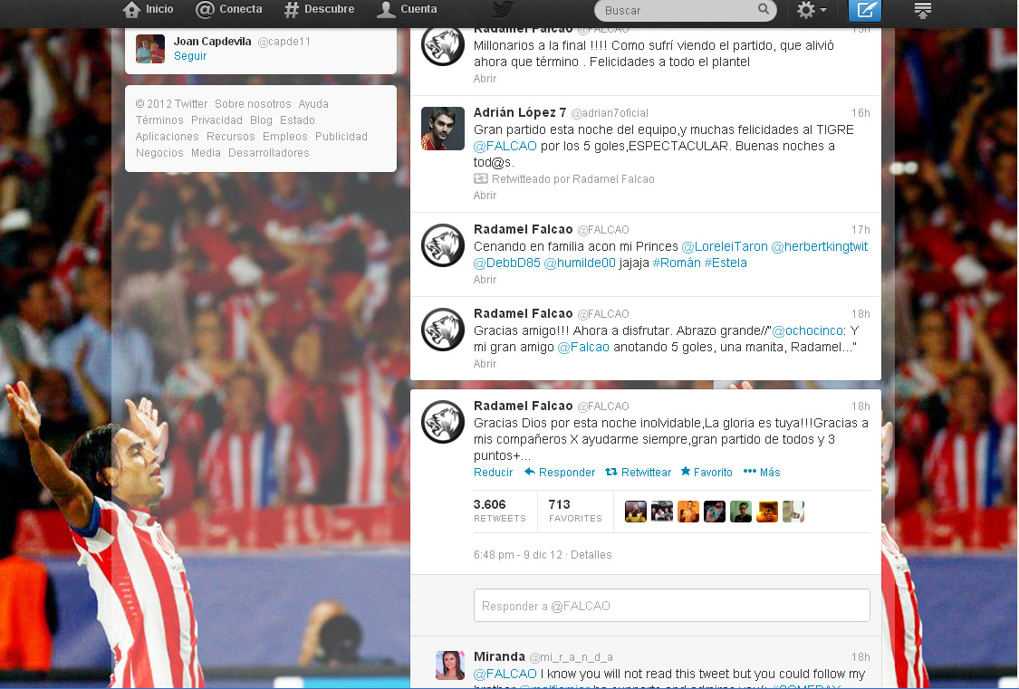 Esta vez, la víctima de “El Tigre”, Radamel Falcao, fue un Deportivo de la Coruña en horas bajas, que nada pudo hacer para frenar la arrolladora voracidad del felino colchonero. En el campo, Juan Carlos Valerón miraba a sus compañeros y movía la cabeza con resignación, lamentando quizás, en su fuero íntimo, que su verdugo deportivo fuera nada más y nada menos que un cristiano evangélico*. (¡Cosas del fútbol!).