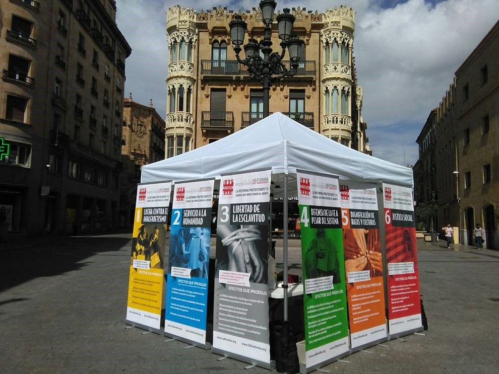 Carpa informativa sobre la Reforma en Salamanca, basada en las «8 causas de la Reforma»