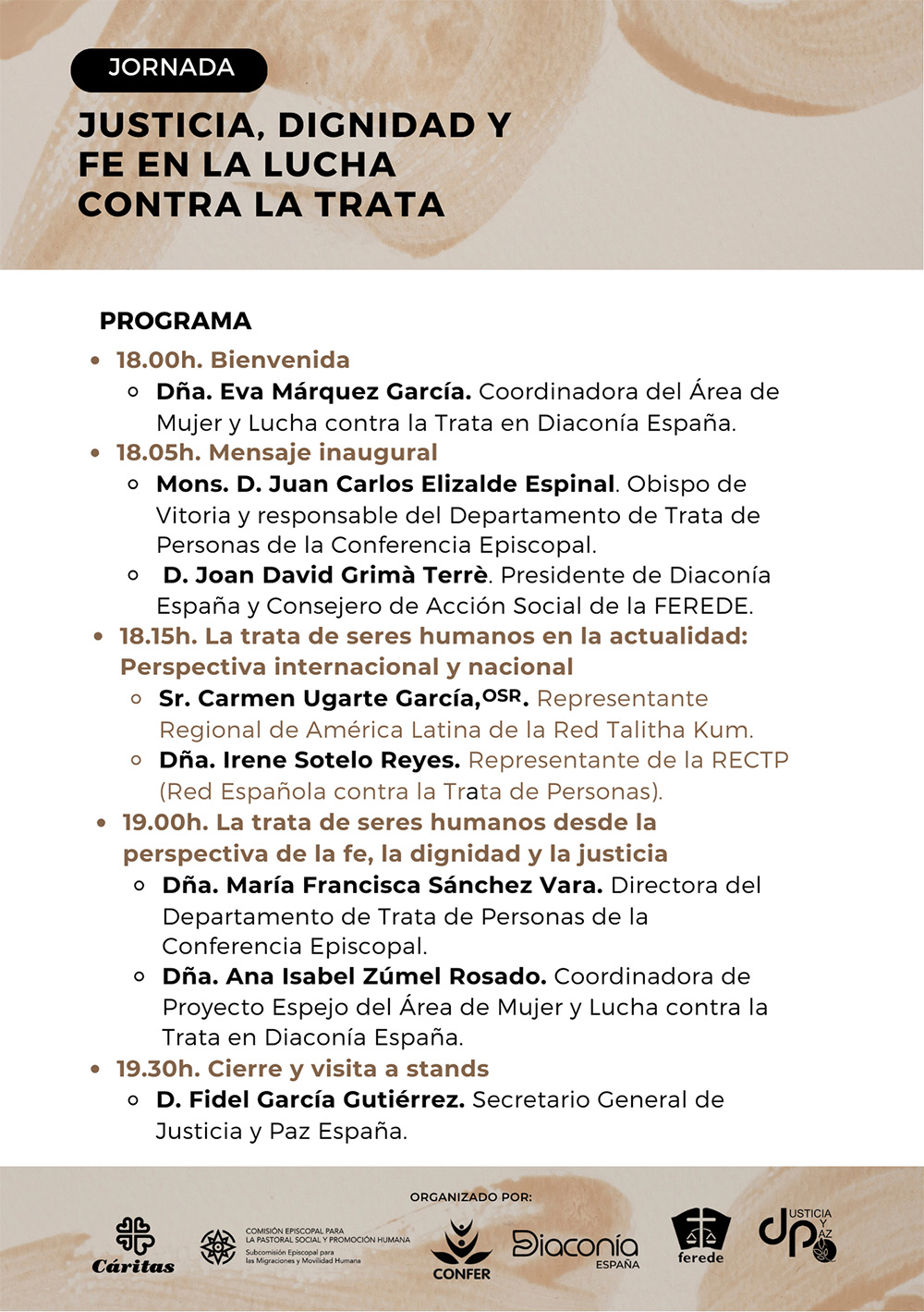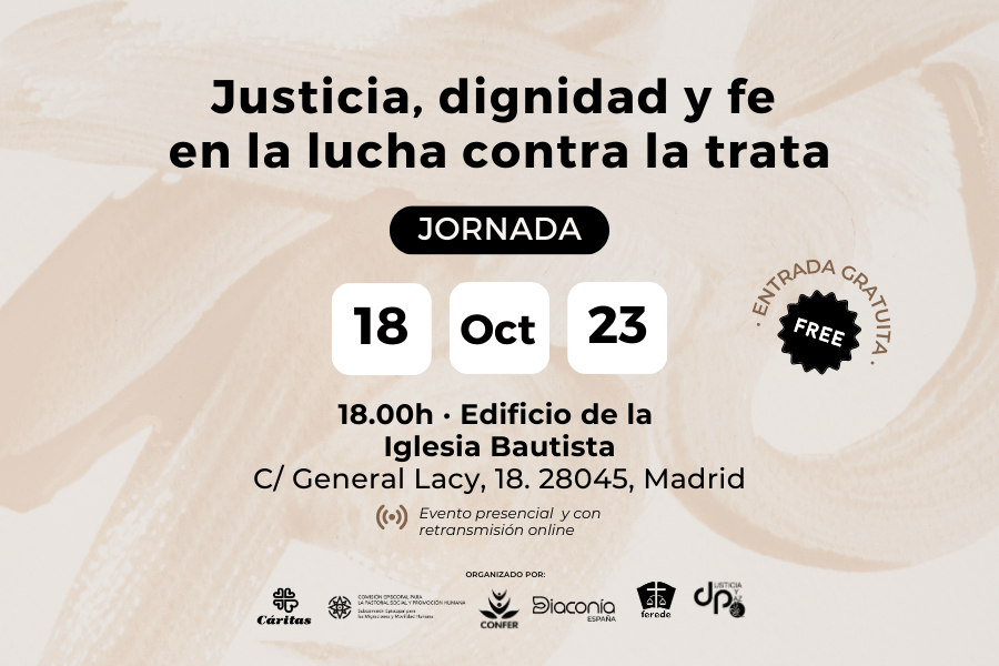 (Redacción, 04/10/2023) Coincidiendo con el Día Europeo contra la Trata de Seres Humanos, que desde el año 2007 la Unión Europea conmemora cada 18 de octubre, media docena de entidades sociales y religiosas, católicas y evangélicas, de primer orden, organizan conjuntamente una Jornada titulada, «Justicia, Dignidad y Fe, en la lucha contra la trata».