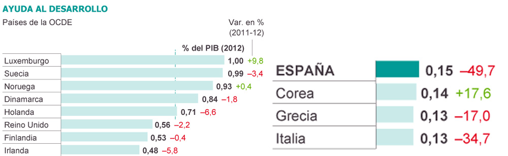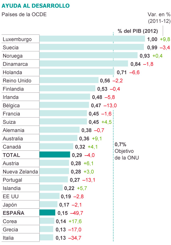 (EL PAÍS, 03/04/20113) España lidera el recorte en ayuda oficial al desarrollo dentro de la OCDE. Entre 2011 y 2012, la cantidad dedicada a fomentar programas en países pobres cayó un 49%, según los datos que la organización ha hecho públicos este miércoles. La cantidad realmente desembolsada fue de 1.948 millones de dólares (unos 1.500 millones de euros), que se corresponde al 0,15% de la Renta Nacional Bruta. Muy lejos ha quedado el objetivo de llegar al 0,7% en 2012 que se fijó el Gobierno de José Luis Rodríguez Zapatero (y que comprometieron los países firmantes de los Objetivos de Desarrollo del Milenio, entre ellos España).
