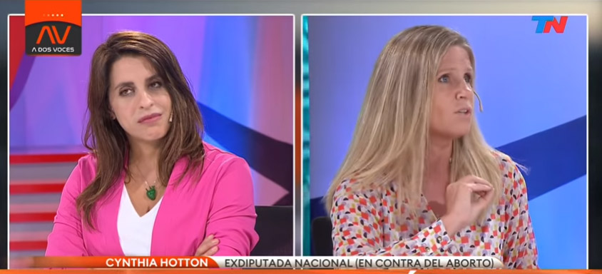 La interventora del Instituto Nacional contra la Discriminación, el Racismo y la Xenofobia (INADI), Victoria Donda y la exdiputada, Cynthia Hotton, discutían  en directo sobre el balance del primer año de gestión del presidente Alberto Fernández, que se cumpía ayer 10 de diciembre, pero rápidamente la disputa giró en torno al debate sobre el aborto.