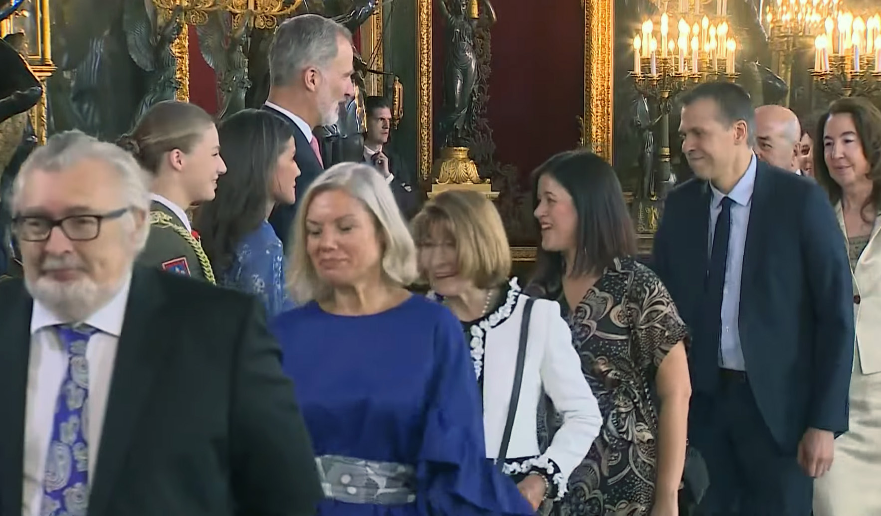 Captura de pantalla del momento en el que la secretaria ejecutiva Carolina Bueno saluda a SSMM los Reyes y a la Princesa de Asturias.