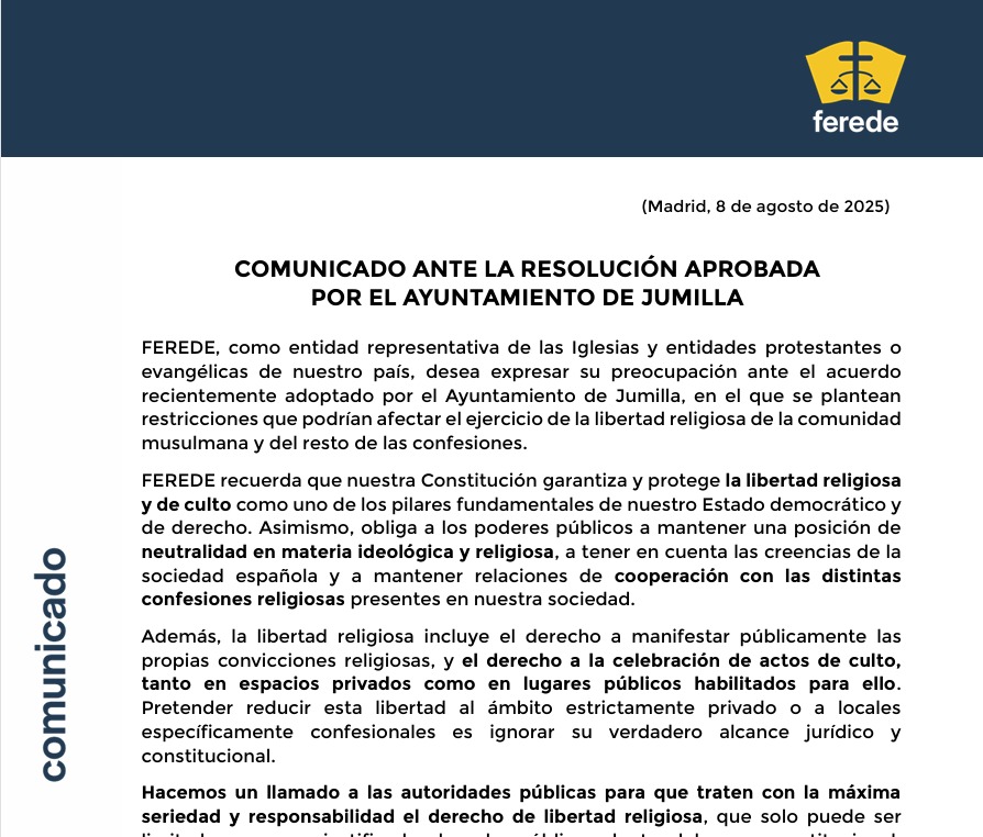 (Madrid, 08/08/2025) La Federación de Entidades Religiosas Evangélicas de España (FEREDE) ha manifestado su inquietud ante la reciente resolución aprobada por el Ayuntamiento de Jumilla, que plantea restricciones que, según la entidad, podrían afectar al ejercicio de la libertad religiosa de la comunidad musulmana y de otras confesiones.
