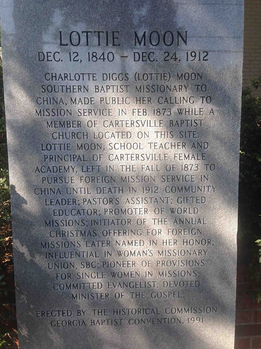 Okeanroe. «Un monumento a Lottie Moon, misionera bautista estadounidense en China, en West Cherokee Street en Cartersville, Georgia»