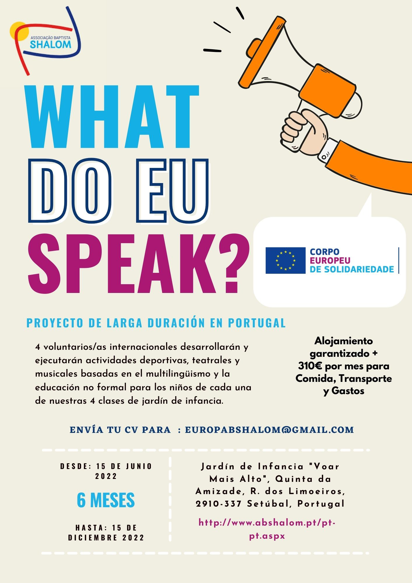“Nuestra Asociación fue fundada en el año 2000 por la Primera Iglesia Evangélica Bautista de Setúbal para dar una respuesta social y de solidaridad por parte de la Iglesia a los problemas de las familias más pobres de Setúbal. Así pues, desde ese año organizamos proyectos de voluntariado, acción social y juvenil en nuestras instalaciones. Hace poco el Presidente Joaquim Moreira me pidió que empezase a contactar y establecer contactos con otras iglesias y asociaciones cristianas evangélicas con el fin de poder integrar jóvenes creyentes de otros lugares de Europa en nuestras actividades a través de los programas Europeos de voluntariado (Erasmus+ y Cuerpo Europeo de Solidaridad, aquí les dejo la web de la Agencia Nacional Española donde explica estos fondos y proyectos: http://www.cuerpoeuropeodesolidaridad.injuve.es/es/que-es-ces)”.