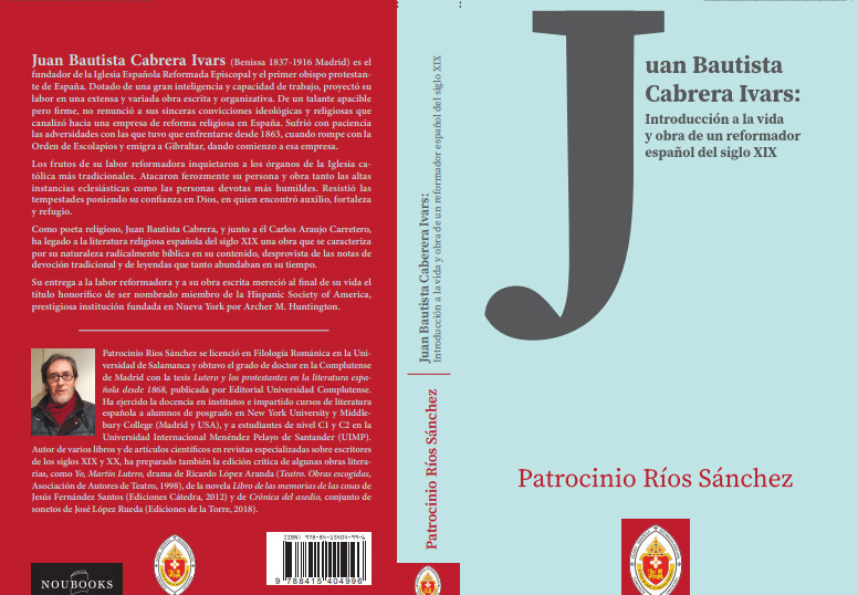 Ahora bien, el tema estrella al que Patrocinio Ríos ha dedicado su interés preferente en los últimos años, ha sido la figura del obispo fundador de la Iglesia Española Reformada Episcopal, Juan Bautista Cabrera Ivars, un escolapio convertido al protestantismo. Y ésta es la obra que hoy nos cabe el honor de presentar.