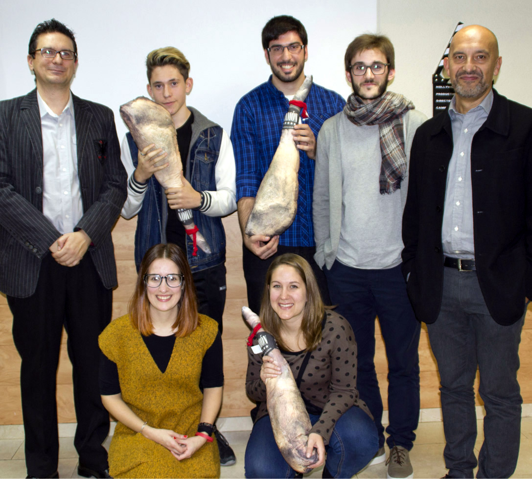 El jurado y los ganadores del Concurso de vídeos Delirante posan con sus premios: «Tarjetas black» y «Jamón-cojín pro-soborno»