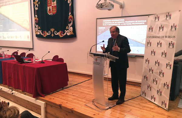 Es bueno que empecemos a saldarla aquí, en Castilla y León. Una Comunidad rica en territorios y gentes. Respetuosa con la pluralidad que la integra. Y defensora de la convivencia que la enriquece desde su mismo nacimiento. Y es bueno que la saldemos en concreto desde la ciudad de Burgos. En esa misma ciudad abierta y cosmopolita en la que hace cinco siglos circulaban de manera vivísima ideas y libros. Y que se convirtió en uno de los grandes focos del erasmismo español, con figuras como Juan de Maldonado, Alonso Ruiz de Virués, el arzobispo Juan de Fonseca o familiares del mismo Enzinas, como Pedro de Lerma. Una ciudad que hoy sigue ofreciendo una rica, intensa y variada vida cultural y académica, de la que este Congreso Internacional es una buena muestra.