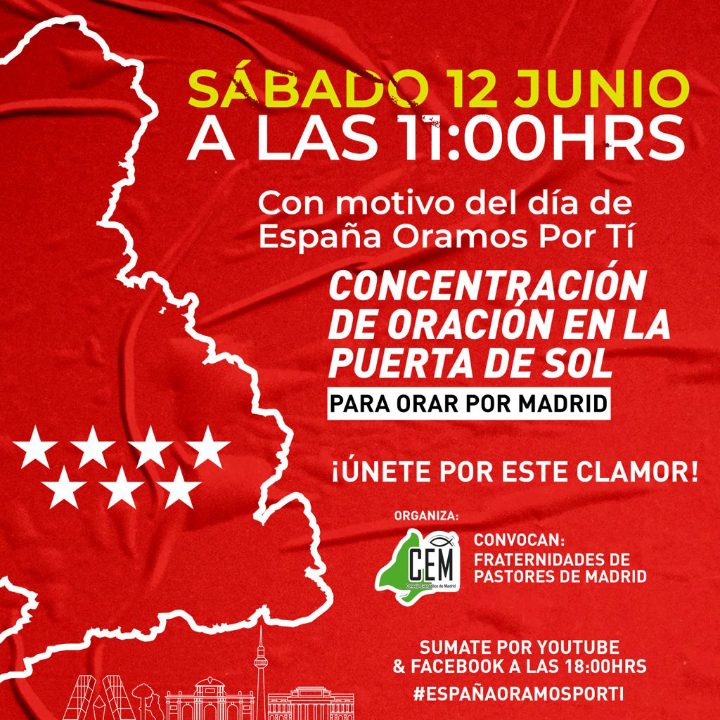 En Madrid, por ejemplo, las fraternidades de pastores y el Consejo Evangélico de Madrid (CEM) están convocando a una concentración en la Puerta del Sol, el mismo sábado 12 de junio a las 11:00 hs, “para orar por Madrid”.