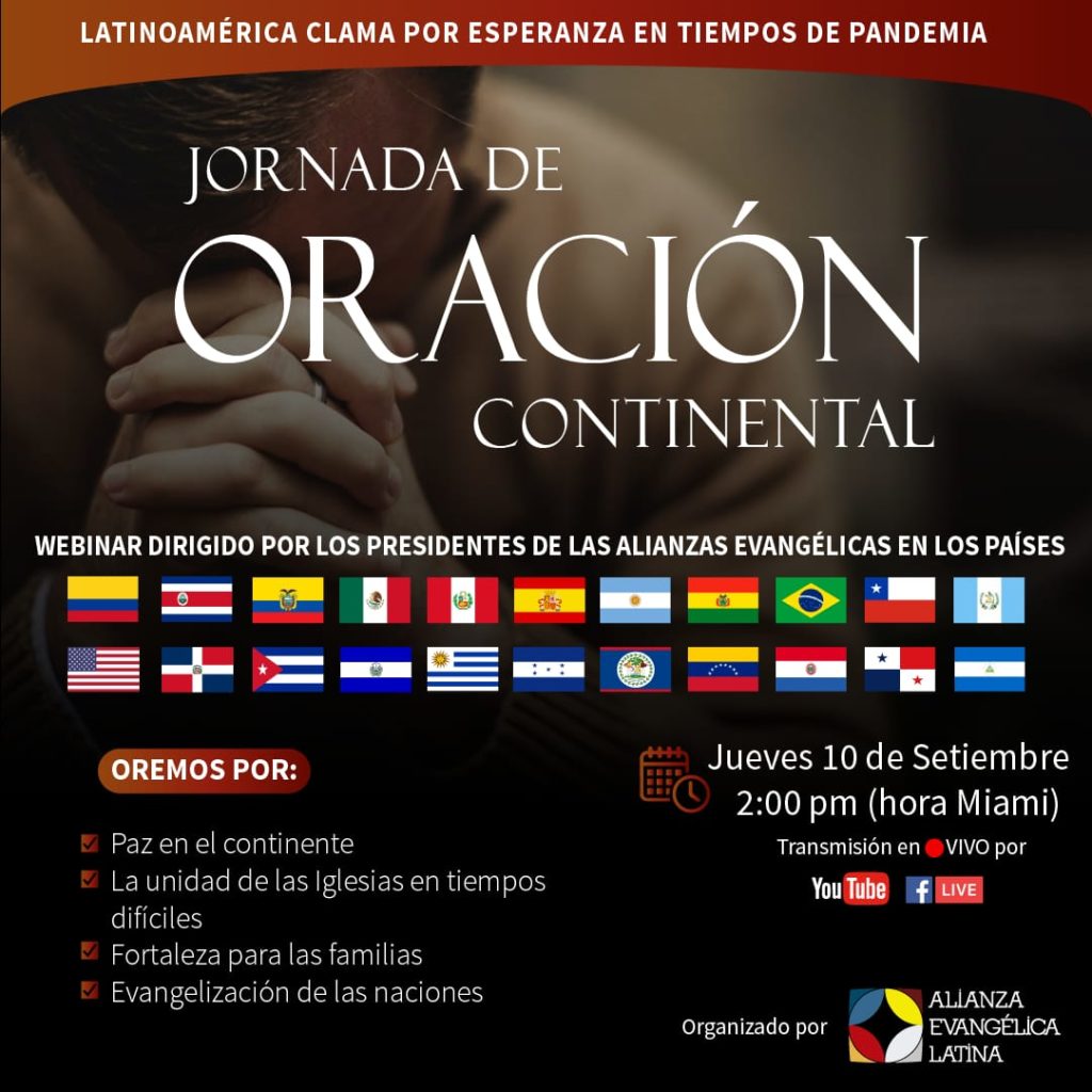 (AEL, 03/09/2020) “La pandemia del covid-19 sigue afectando a miles de personas en toda Iberoamérica y más que nunca debemos unirnos en oración y clamor, por las familias, la iglesia y por sobre todo para no perder la esperanza en medio de la desesperación”. Con este mensaje la Alianza Evangélica Latina (AEL) convoca a los 22 países miembros y sus respectivas alianzas evangélicas a una jornada de oración el día 10 de septiembre desde las 2 p.m. (hora de Miami, 20:00 hs en España).