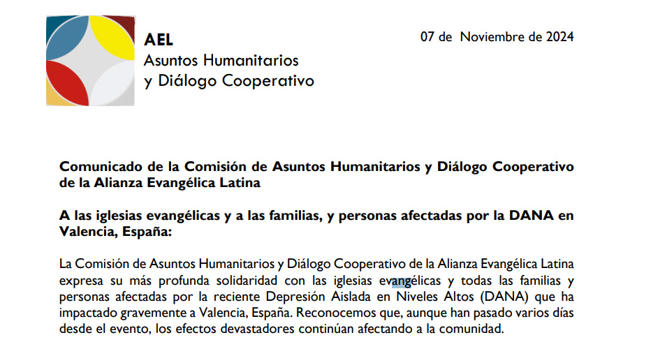 En un comunicado difundido a través de sus página web y sus redes sociales, y firmado por la Comisión de Asuntos Humanitarios y Diálogo Cooperativo de AEL, la entidad evangélica expresó “su más profunda solidaridad con las iglesias evangélicas y todas las familias y personas afectadas por la reciente Depresión Aislada en Niveles Altos (DANA) que ha impactado gravemente a Valencia, España”.