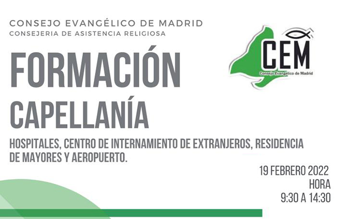(MADRID, 29/11/2021) La Consejería de Asistencia Religiosa del Consejo Evangélico de Madrid (CEM) anuncia su próxima jornada de Formación para Capellanes de Hospitales; Centros de Internamiento de Extranjeros (CIE); Residencia de Mayores; y Aeropuerto.