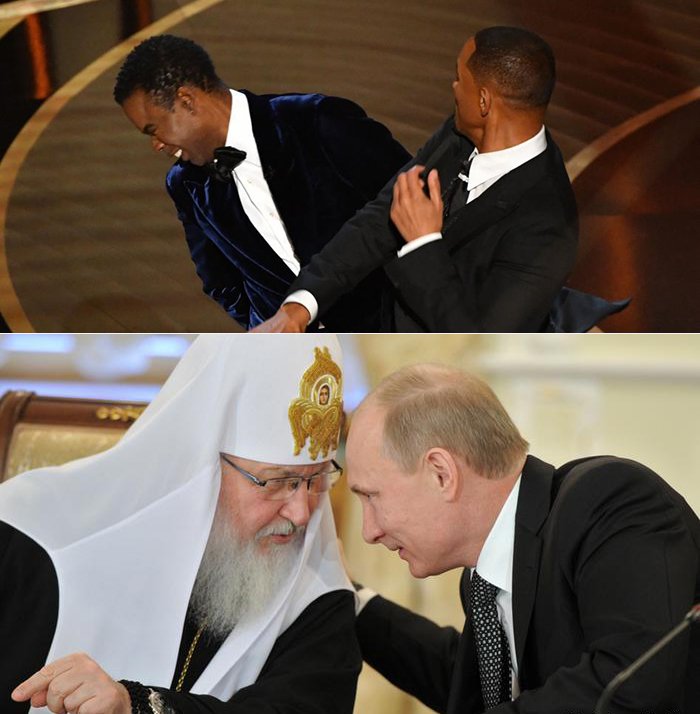 Arriba: Will Smith abofetea a Chris Rock en la Gala de los Oscar. Abajo: Sociedad religioso-civil para la guerra (el Patriarca ortodoxo de Moscú Cirilo I junto a Vladimir Putin)