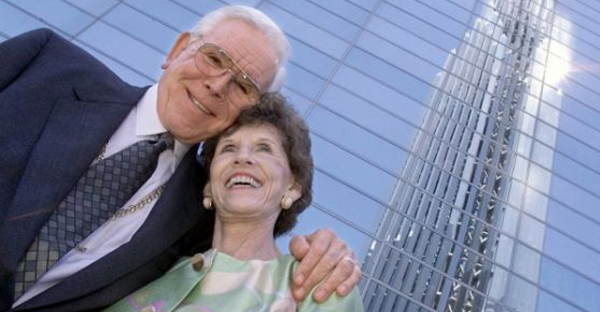 Tiempos felices. Robert Schuller, junto a su esposa Arvella, en una foto de archivo, junto a la Catedral de Cristal