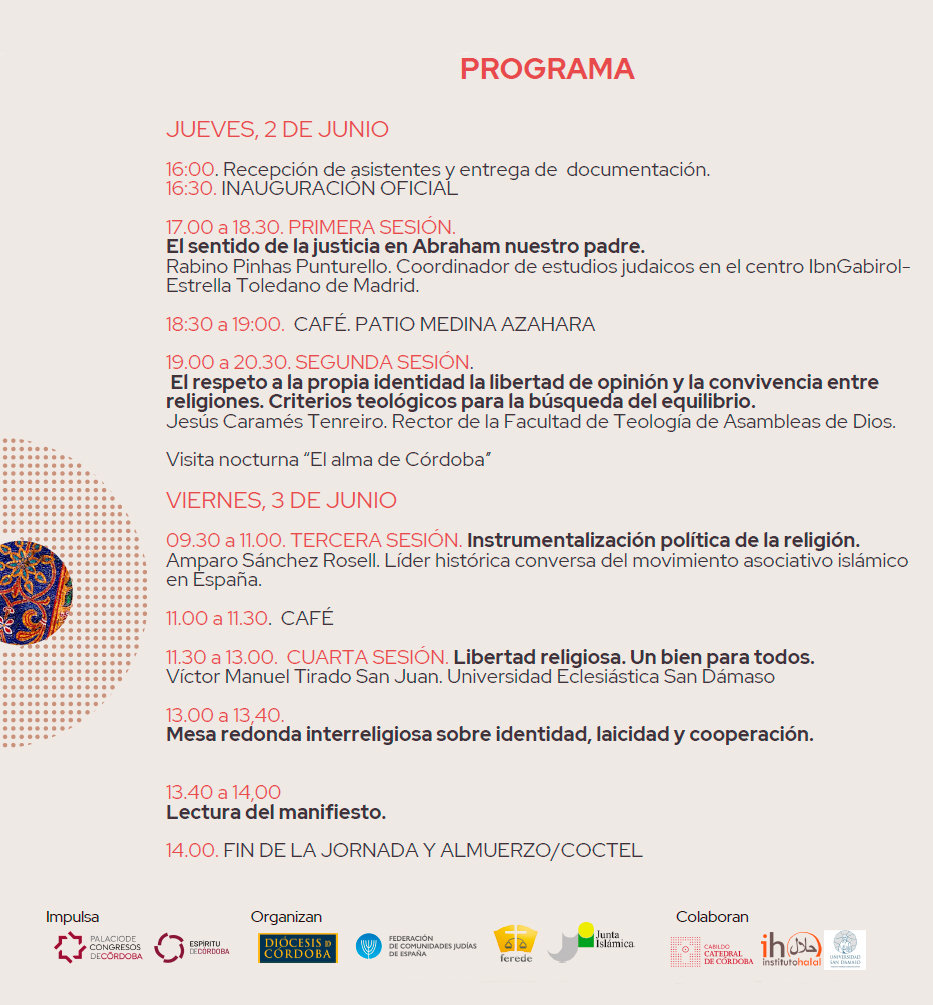 Este encuentro, impulsado por el Palacio de Congresos de Córdoba, cuenta con la organización de la Diócesis de Córdoba, de la Federación de Comunidades Judías de España, de la Federación de Entidades Religiosas Evangélicas de España (FEREDE) y de la Junta Islámica de España.