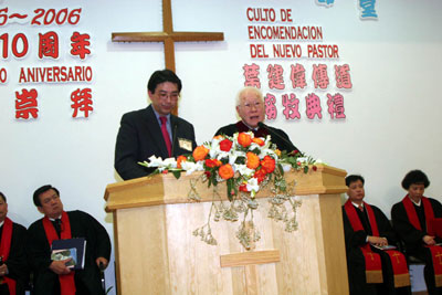El Rev. Moses Yang (Derecha), durante su discurso